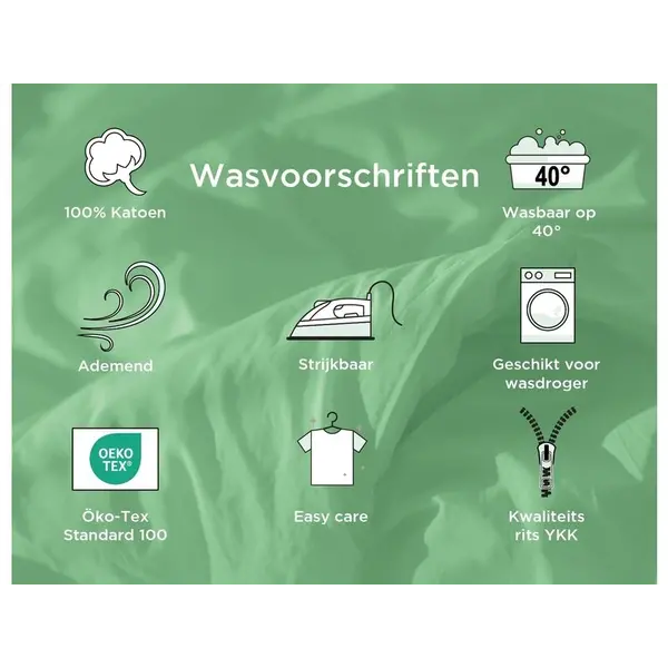 Wij adviseren onze klanten het dekbedovertrek binnenste buiten te wassen. Binnenste buiten wassen verlengt de levensduur van het overtrek. Lees voor het wassen en drogen altijd het was-label voor de juiste temperaturen.