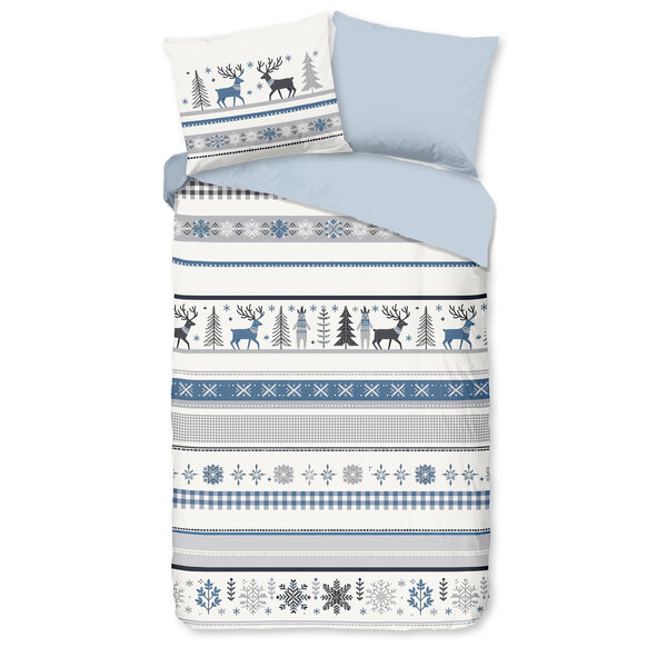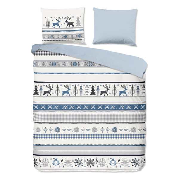 Flanellen dekbedovertrek Aila van Good Morning, in de kleur blauw, met een print van eenWinterse print. Het dekbedovertrek is gemaakt van 100% katoen/flanel dat is licht geruwd, waardoor een fluweelzacht laagje ontstaat dat heerlijk warm aanvoelt -perfect voor koude nachten.