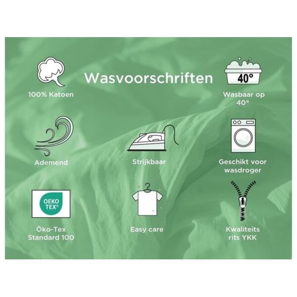 Wij adviseren onze klanten het dekbedovertrek binnenste buiten te wassen. Binnenste buiten wassen verlengt de levensduur van het overtrek. Lees voor het wassen en drogen altijd het was-label voor de juiste temperaturen.