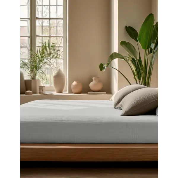 De bovenzijde van dit hoeslaken is vervaardigd uit katoen mousseline en de onderzijde uit 100% katoen T180, een combinatie die bekendstaat om zijn stevigheid en lange levensduur. Dankzij de natuurlijke stretch sluit het hoeslaken perfect aan, zonder los te laten of te verschuiven tijdens het slapen. Bovendien voelt de stof soepel en luxe aan, waardoor jouw bed niet alleen heerlijk ligt maar er ook prachtig uitziet. Zelfs na vele wasbeurten behoudt het hoeslaken zijn vorm en kwaliteit, zodat je langdurig kunt genieten van optimaal comfort.