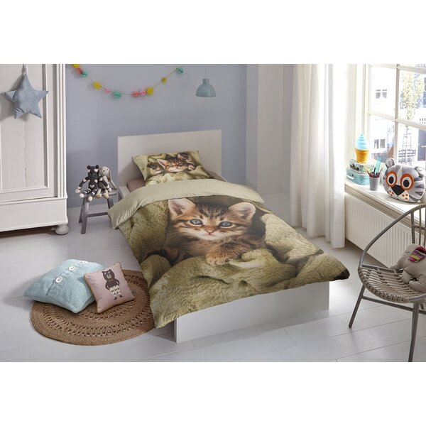 Op het overtrek zie je een donzig katje met grote, blauwe ogen dat knus ligt opgerold in een zachte groene deken. Op het bijpassende kussensloop ligt hetzelfde katje heerlijk te slapen met de pootjes omhoog een vertederend beeld dat rust en geborgenheid uitstraalt. De realistische print en warme kleuren maken van dit dekbedovertrek een echte blikvanger.