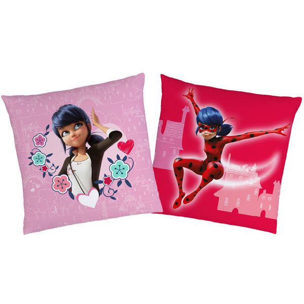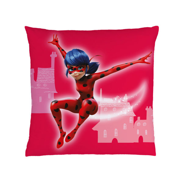 Miraculous Sierkussen Secret. Dit rood/roze kussentje heeft twee super coole kanten! Op de ene kant springt Lady Bug door de lucht, op de andere kant poseert Marinette alsof er niks aan de hand is ;) Dit leuke kussentje past perfect bij het apart verkrijgbare Secret dekbedovertrek. Kenmerken Formaat 40 x 40 cm Materiaal: 100% Polyester Geen sluiting Wasbaar op 30 graden Niet geschikt voor wasdroger