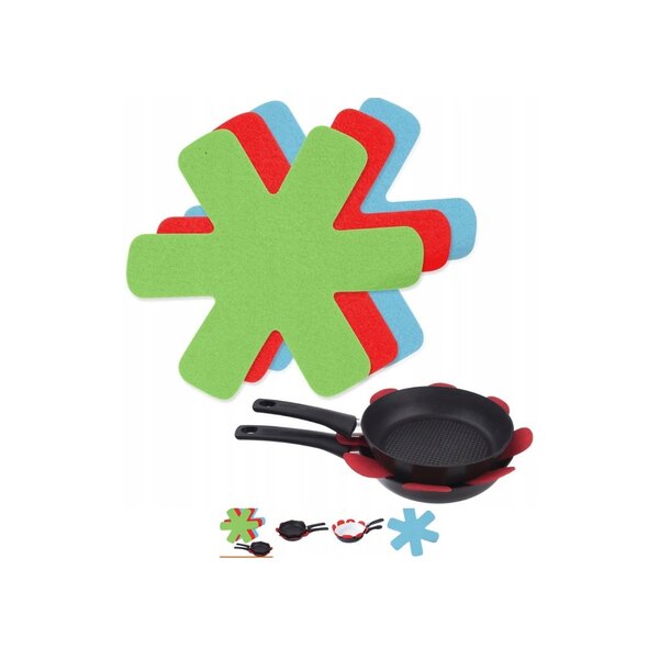 Set van vijf kleurrijke, beschermende verdelers voor schalen. Ze beschermen pannen, potten, kommen en ander servies tegen krassen. Handig in elke keuken.