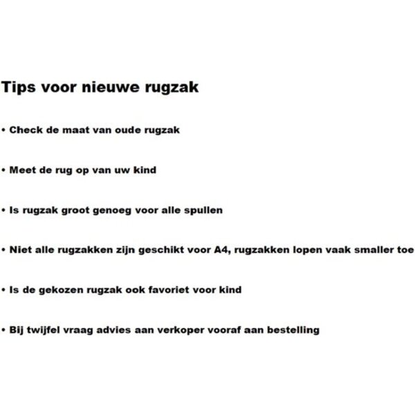 Controleer voor de aankoop de maat die u nodig heeft. Een handige tip is om de rug van uw kind op te meten en te vergelijken met de afmetingen van de rugzak. Let ook op dat tassen aan de bovenkant vaak smaller zijn dan aan de onderkant.