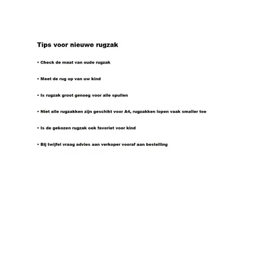 Controleer voor de aankoop de maat die u nodig heeft. Een handige tip is om de rug van uw kind op te meten en te vergelijken met de afmetingen van de rugzak. Let ook op dat tassen aan de bovenkant vaak smaller zijn dan aan de onderkant.