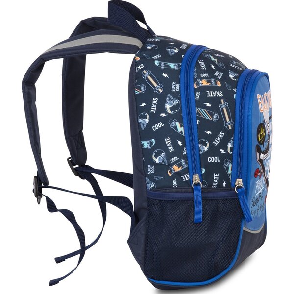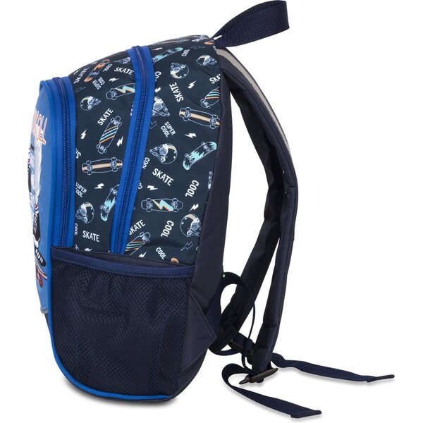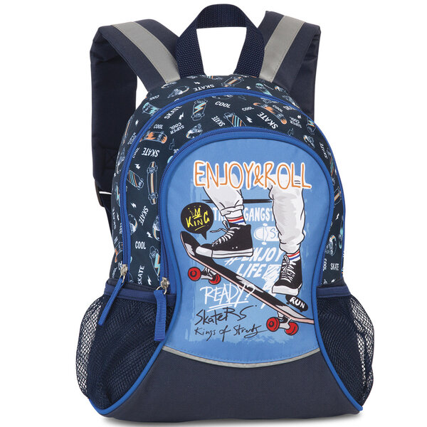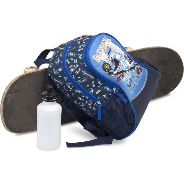 Fabrizio Rugzak, Enjoy & Roll. Deze gave, blauwe rugzak is ideaal voor school of jouw sportactiviteiten, zoals skaten. De gave print van een ollie-ende skateboarder is helemaal geweldig! Daar mag je mee gezien worden op de skatebaan. Uiteraard ook geschikt voor op reis of een dagje weg. De rugzak heeft twee grote vakken die kunnen worden gesloten met een ritssluiting en twee open vakken aan de zijkant voor, bijvoorbeeld, een bidon. Een perfect cadeau waar elke skateboard fan blij mee zal zijn.