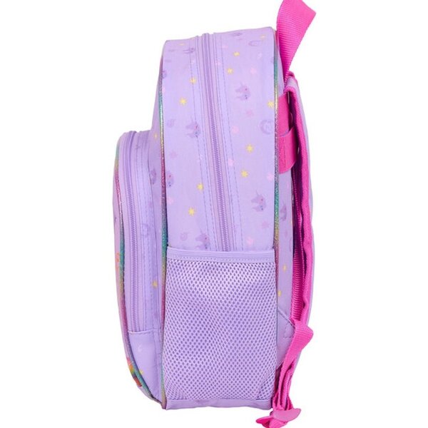 Met deze magische, lila Unicorn Academy rugzak wordt elke dag een sprookje. Op de voorkant schittert een prachtige eenhoorn met regenboogkleurige manen, klaar om jouw spullen te bewaken met een beetje glitter en een heleboel vrolijkheid. Een ideale tas voor school, de opvang, een dagje weg of een logeerpartijtje. Dankzij de gepolsterde en verstelbare schouderbanden zit de tas altijd comfortabel en met de 2 ritsvakken en 1 open zijvak neem je alles georganiseerd mee op pad. Niet geschikt voor een A4 map, maar genoeg ruimte voor een lunchdoos, drinkbeker en enkele schoolspullen. Superleuk cadeau als verrassing voor een verjaardag, feestdag of om het nieuwe schooljaar magisch te beginnen!