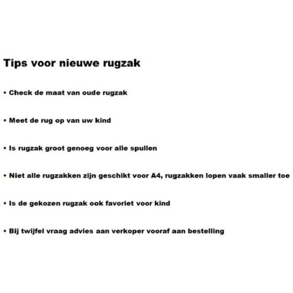 Controleer voor de aankoop de maat die u nodig heeft. Een handige tip is om de rug van uw kind op te meten en te vergelijken met de afmetingen van de rugzak. Let ook op dat tassen aan de bovenkant vaak smaller zijn dan aan de onderkant.
